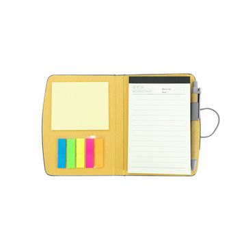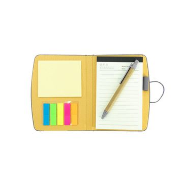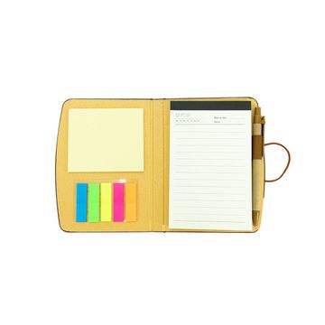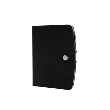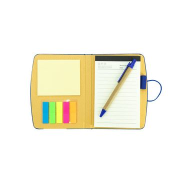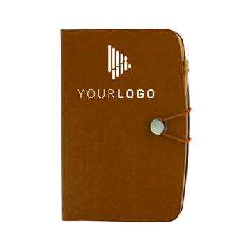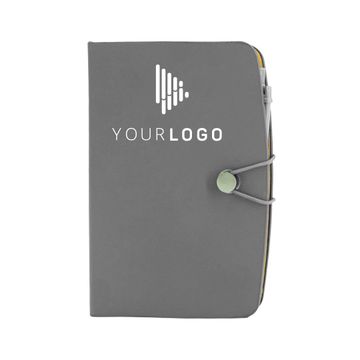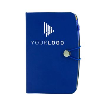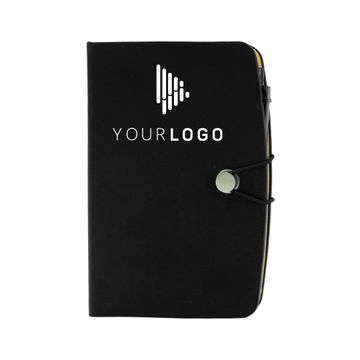 Bungee Latched, Leather Bound Legal Pad Notebook with accessories make this product a great promotional item/gift! Includes sticky note pad, colored organizer tabs and a pen, all attached to the inside of the notebook! Each notebook comes individually packaged in a white cardboard box.