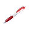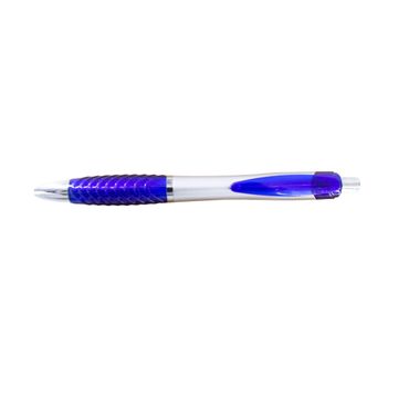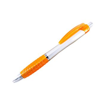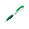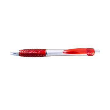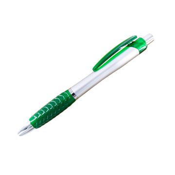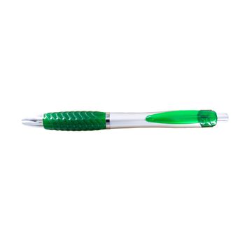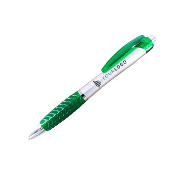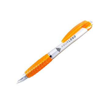 A ballpoint pen with soft silicone fingered in colorful options. The material is plastic based with 4 different colors (blue, green, red, and orange).