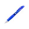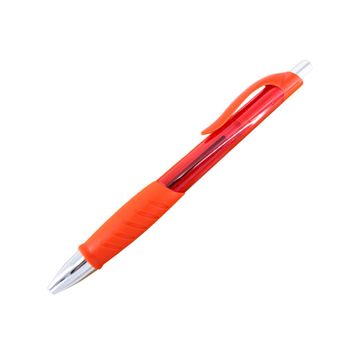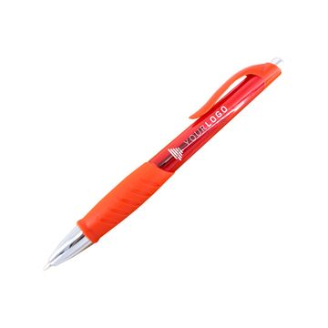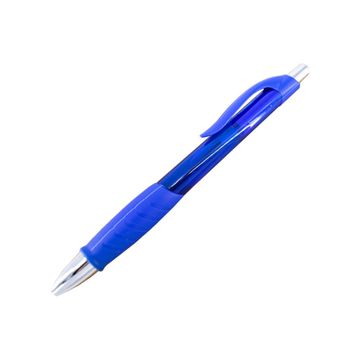A click-action ballpoint pen with soft silicone fingered. The material is plastic based with 2 body colors (blue and red).