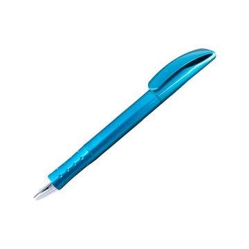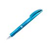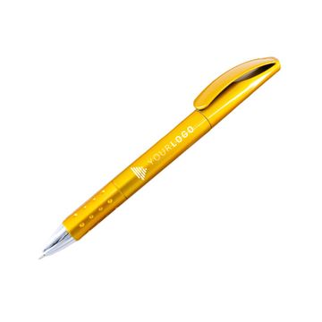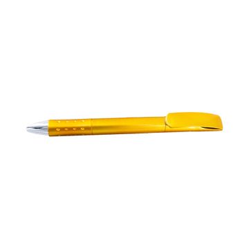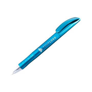 A unique design clicker-action pen with shinny metallic barrel. The material is plastic. It is available in 3 body colors - blue, gold and red.